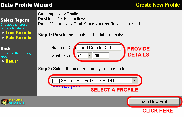 - Click on the Auspicious Date link, which opens up a Report Wizard on the right frame.